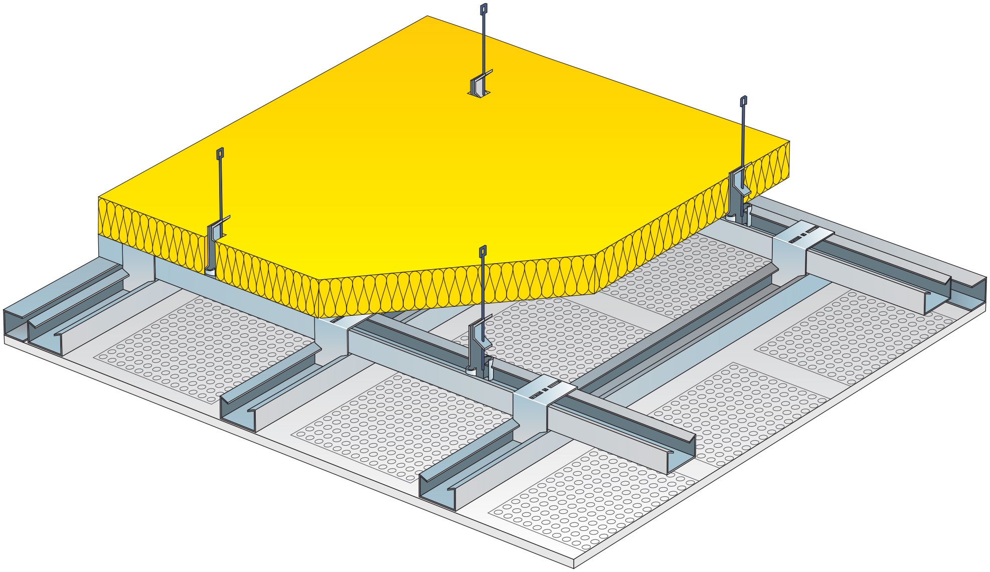 Hrany desek jsou z výroby zbroušené a napenetrované, tedy můžeme rovnou přistoupit k montáži na profily. Pro montáž akustických desek doporučujeme použít originální sesazovače, tzv. „hřebeny“, určené pro daný vzor perforace. Použití sesazovačů zajistí vznik stejně velké spáry po obvodu všech desek, a tím i dokonalou návaznost perforace v celém podhledu.