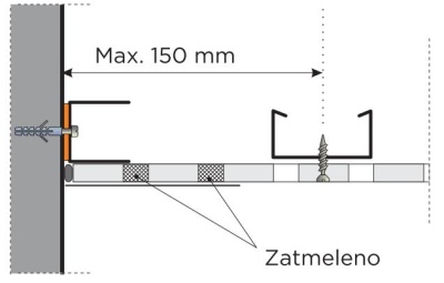 Při napojení desek Rigitone na stěnu, nikdy nešroubujeme desku do obvodového R-UD Profilu.