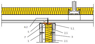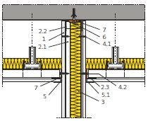V případě napojení příčky na podhled je třeba omezit prostup zvuku meziprostorem nad podhledem. To lze řešit provedením příčky až k nosnému stropu – viz detail 5.16.01.