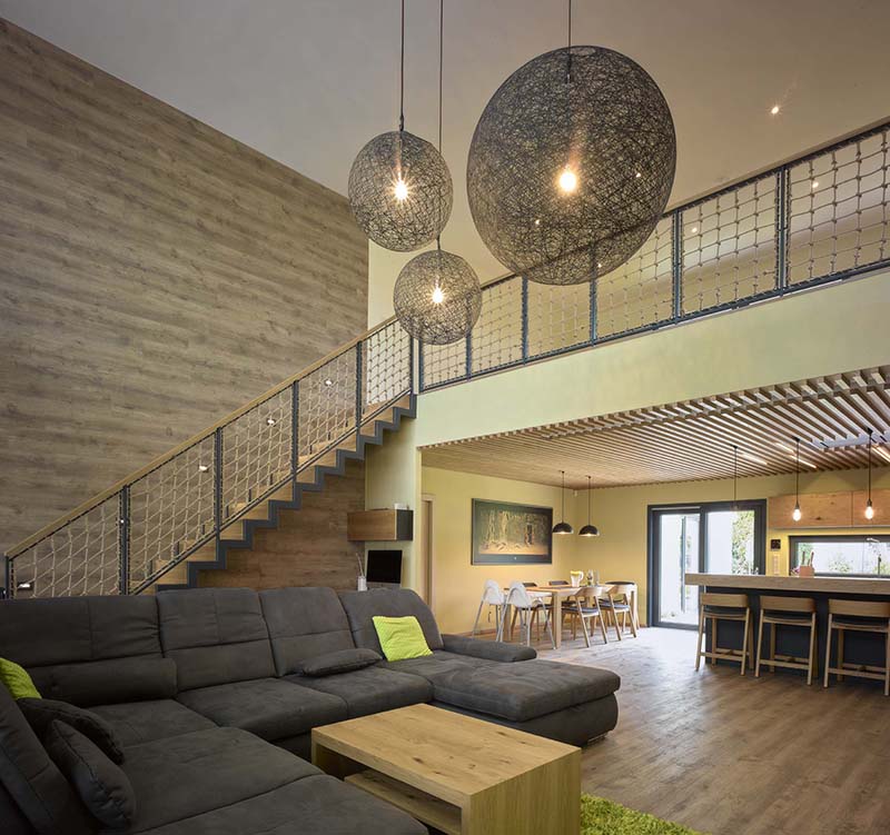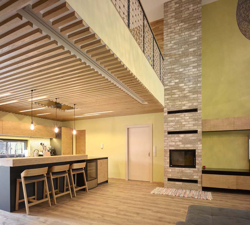 Interiér je vkusnou kombinací dřeva a hladkých ploch ze sádrokartonu Rigips.