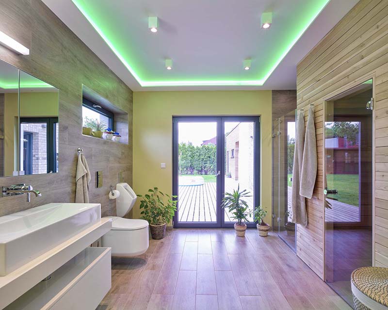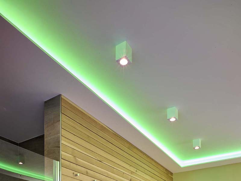 Designový podhled s obvodovou světelnou rampou z impregnovaných desek RBI(H2).