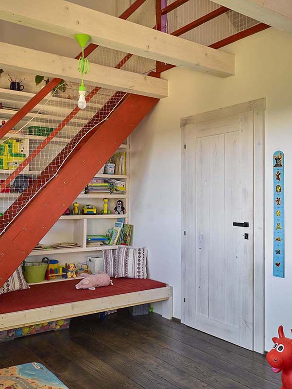 Dětský pokoj rodinného domu Haratice dřevostavba se sádrovláknitými deskami Rigidur v podkroví  Koupelna rodinného domu Haratice, dřevostavby se sádrovláknitými deskami Rigidur